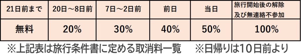 自動的に「契約解除」となった場合、お客さまには、当該時点の旅行条件書に定められた取消料と同額の違約料をご負担いただくことになります。