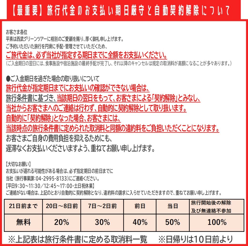 ※ご入金期日を過ぎた場合の取り扱いについて 旅行代金が指定期日までにお支払いの確認ができない場合は、旅行条件書に基づき、当該期日の翌日をもって、お客さまによる「契約解除」とみなし、当社からお客さまへのご連絡は行わず、自動的に契約解除として取り扱います。
